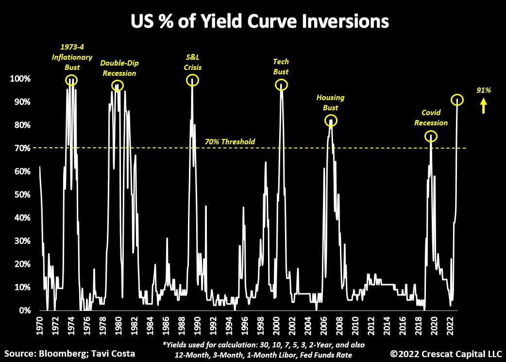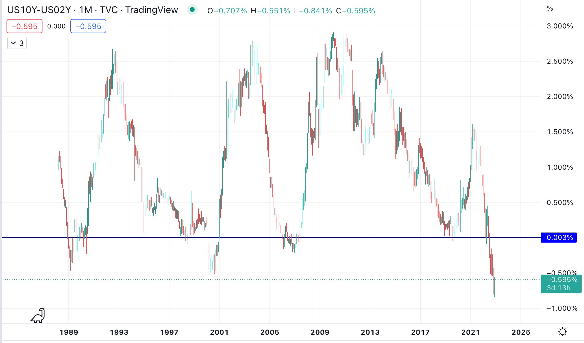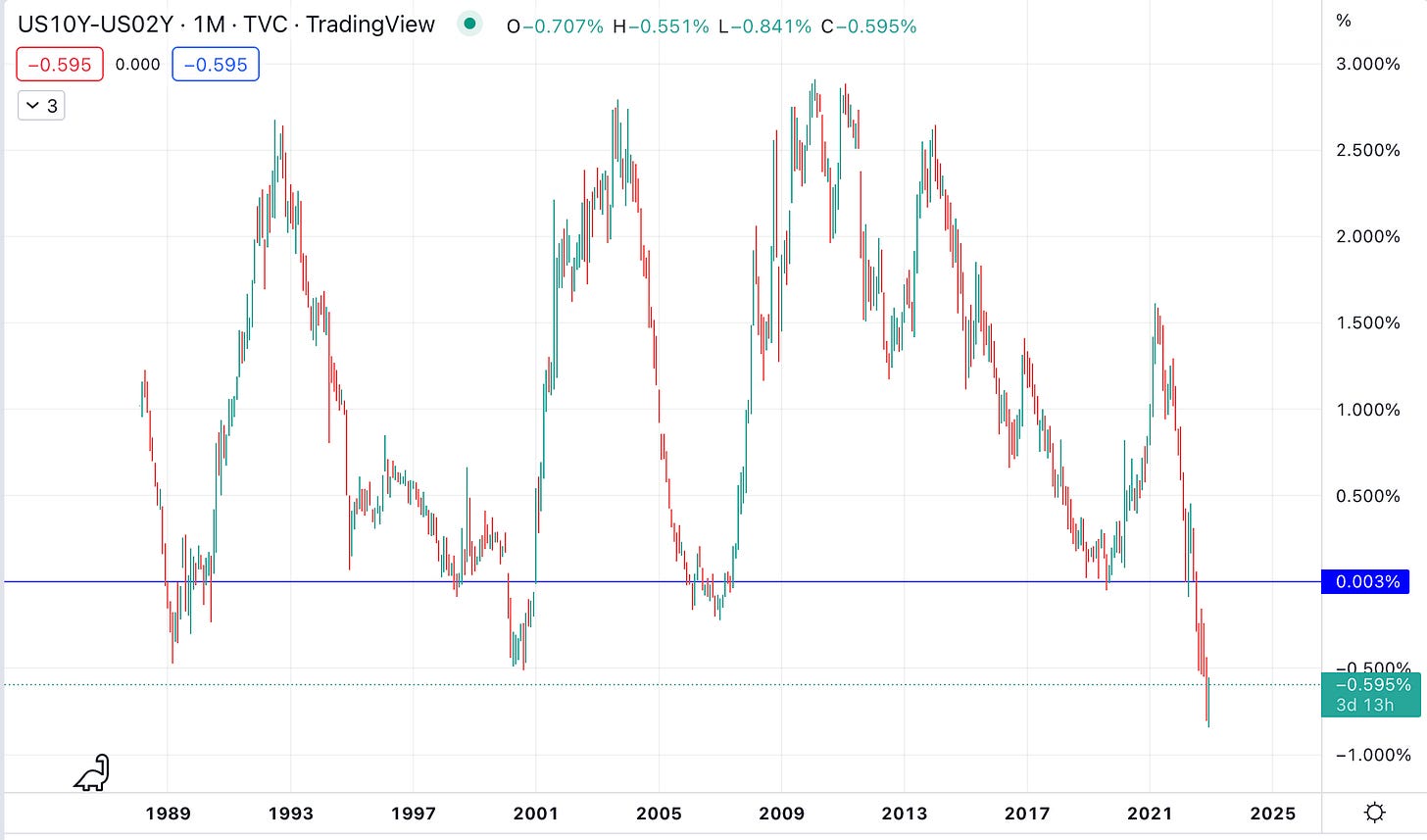 This liquidity tightening have also cause one of the deepest yield curve inversion, where the 10Y-2Y curve in USA is trading close at -0.595%. For those who aren’t familiar over the implication of this please scroll to the next pic.