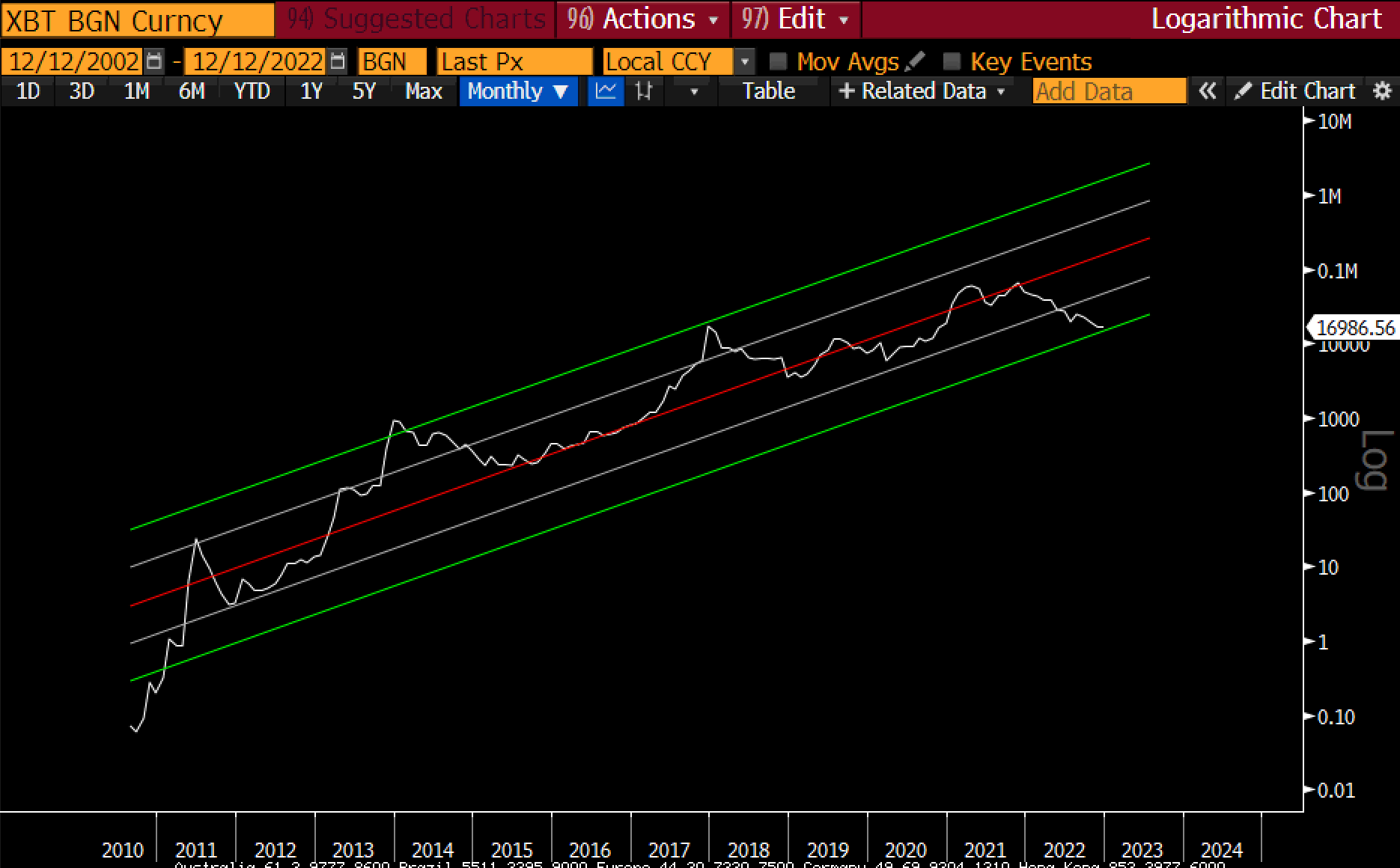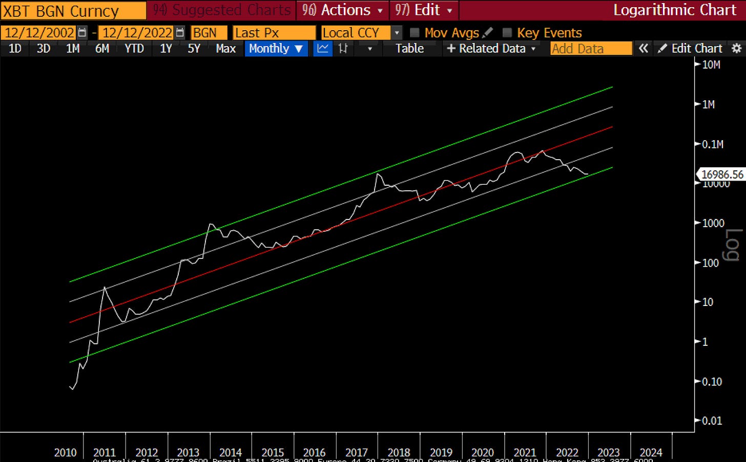 I would be bearish after digesting all the charts above however when we put btc on a log regression channel, it is currently 2 std deviation oversold.